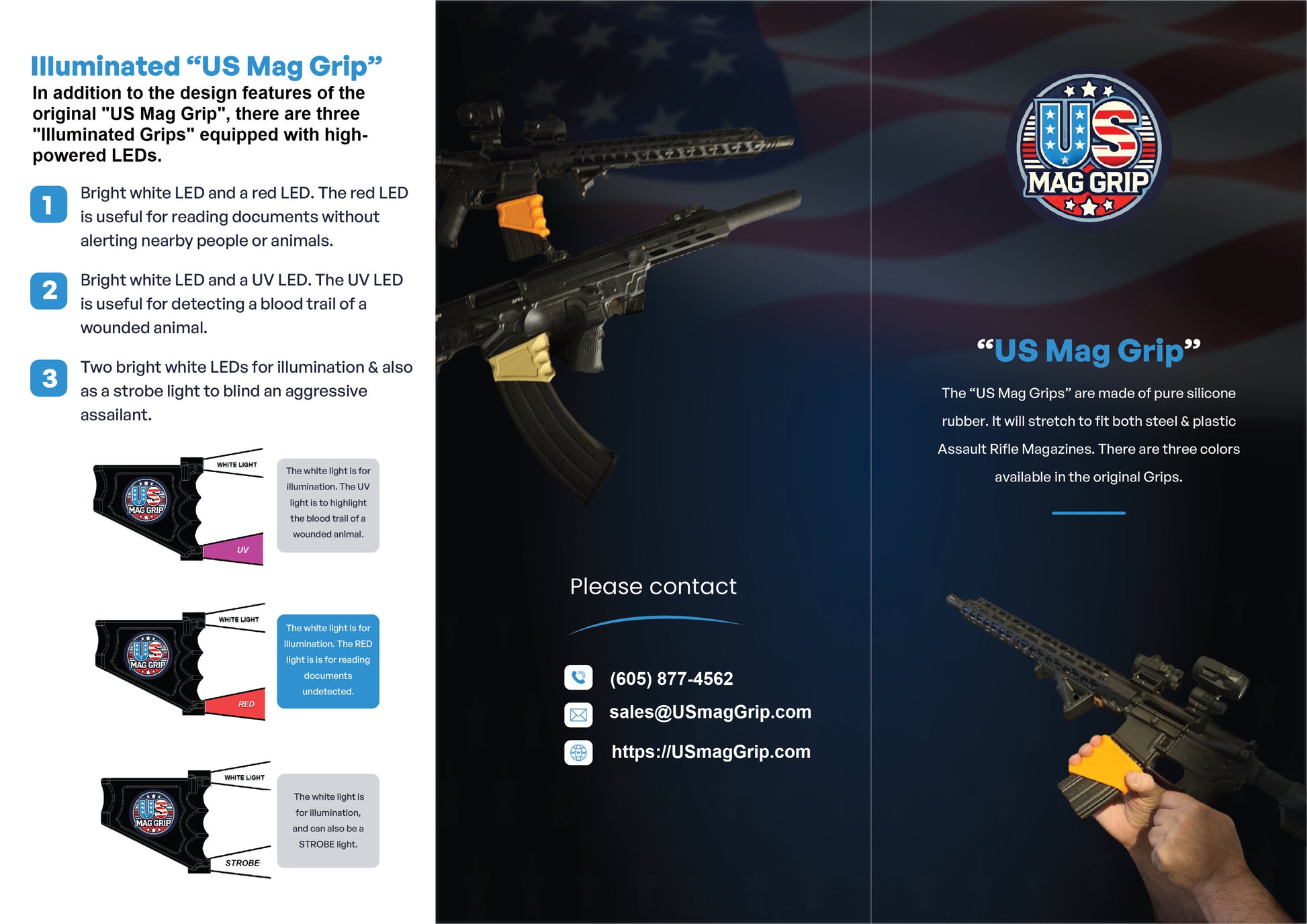 In addition to the design features of the original “US Mag Grip," there are three illuminated grips equipped with high-powered LEDs.
